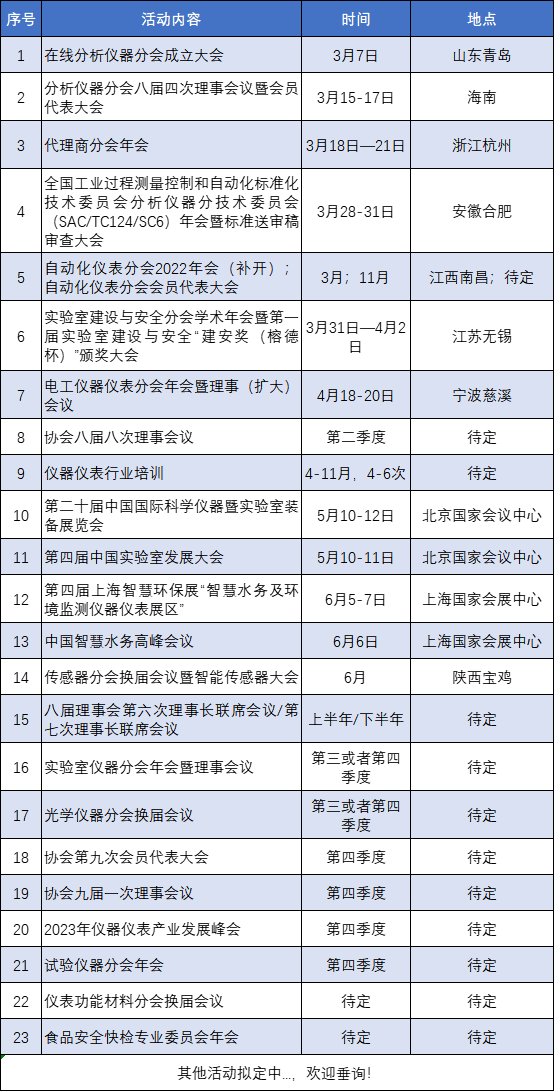 為發(fā)揮中國儀器儀表行業(yè)協(xié)會支撐政府、服務(wù)行業(yè)的橋梁作用,促進行業(yè)間交流與合作,引導(dǎo)產(chǎn)業(yè)健康發(fā)展,推進各項工作的開展,更好地為協(xié)會會員單位服務(wù),特制定中國儀器儀表行業(yè)協(xié)會2023年度主要活動安排,供大家了解參與。
