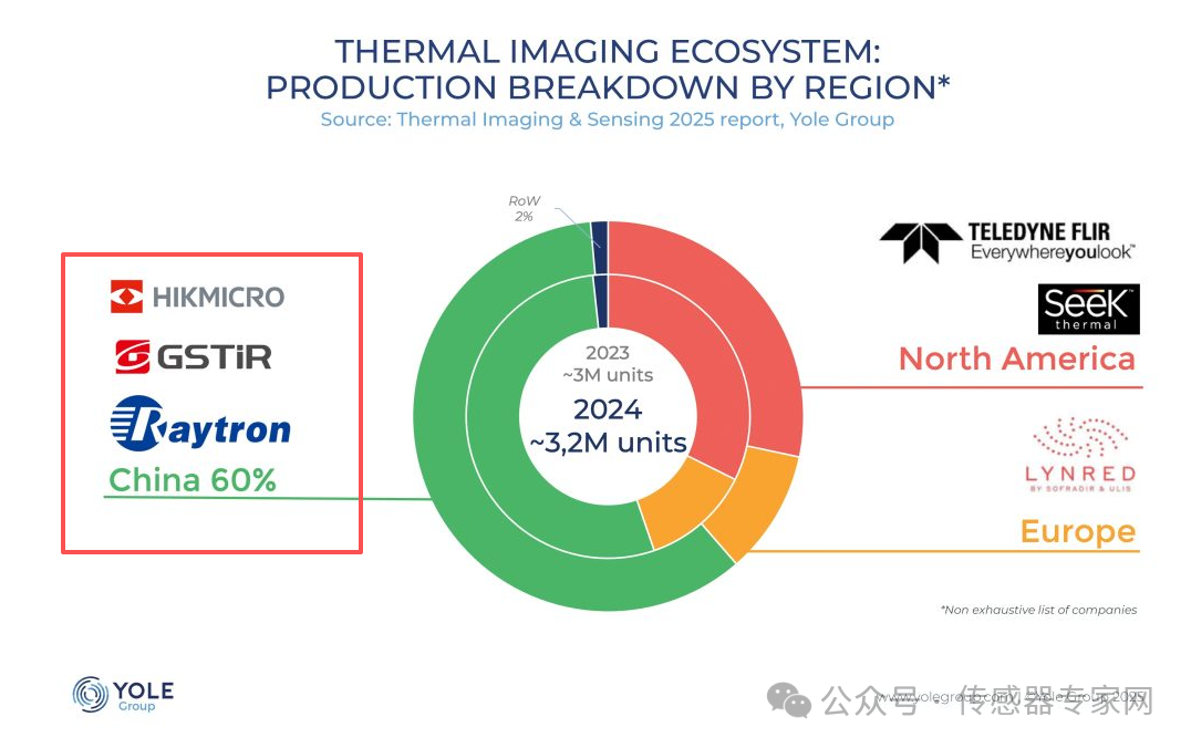 根據Yole 8月份剛剛發布的最新《Thermal Imaging and Sensing 2025》(《熱成像與傳感2025》)報告顯示,以??滴⒂埃?/span>Hikmicro)、高德紅外(Gstir)、睿創微納(Raytron)為代表的中國紅外傳感公司,占據全球60%的市場份額。