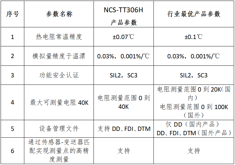NCS-TT306H采用數(shù)字化技術(shù),內(nèi)置24bit高性能ADC,實現(xiàn)高可靠性、高測量精度和高長期穩(wěn)定性,滿足各種工業(yè)現(xiàn)場的測溫需求。真正雙通道設(shè)計,6端子的傳感器設(shè)計可滿足不同的雙輸入組合,可用于對冗余有要求的關(guān)鍵應(yīng)用場合。符合IEC 61508功能安全標(biāo)準(zhǔn)的全面評估,安全等級達到了SIL2、SC3的要求。