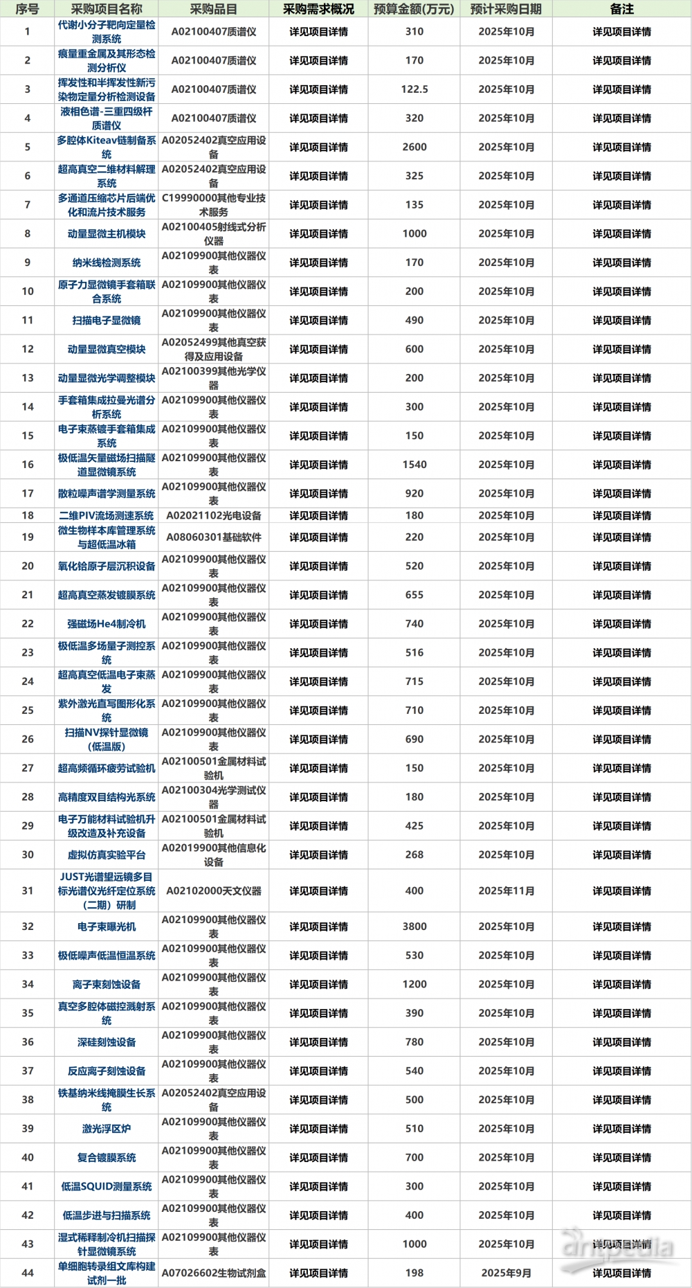 中國政府采購網消息,近日,上海交通大學連續(xù)發(fā)布2025年度9月、10月及11月政府采購意向。內容顯示,該批次采購意向采購標的涵蓋多類科研儀器設備及專業(yè)技術服務,包括代謝小分子靶向定量檢測系統(tǒng)、液相色譜 -三重四級桿質譜儀、極低溫矢量磁場掃描隧道顯微鏡系統(tǒng)等。公開信息顯示,該批次采購預算總金額達到2.67億元,采購日期方面,除“單細胞轉錄組文庫構建試劑一批”及“JUST光譜望遠鏡多目標光譜儀光纖定位系統(tǒng)(二期)研制”將于9月和11月采購之外,其余項目均將于10月份進行采購。具體信息已項目相關采購公告和采購文件為準。
