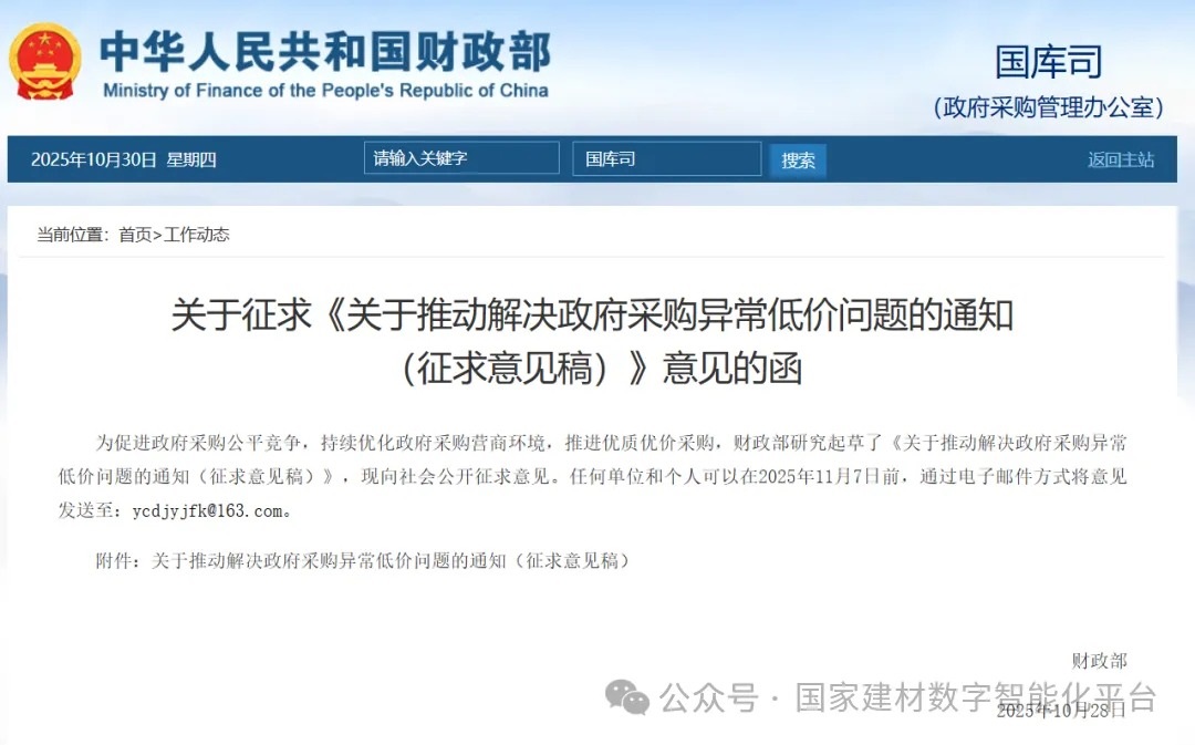 10月28日,財(cái)政部發(fā)布關(guān)于征求《關(guān)于推動解決政府采購異常低價(jià)問題的通知(征求意見稿)》意見的函。