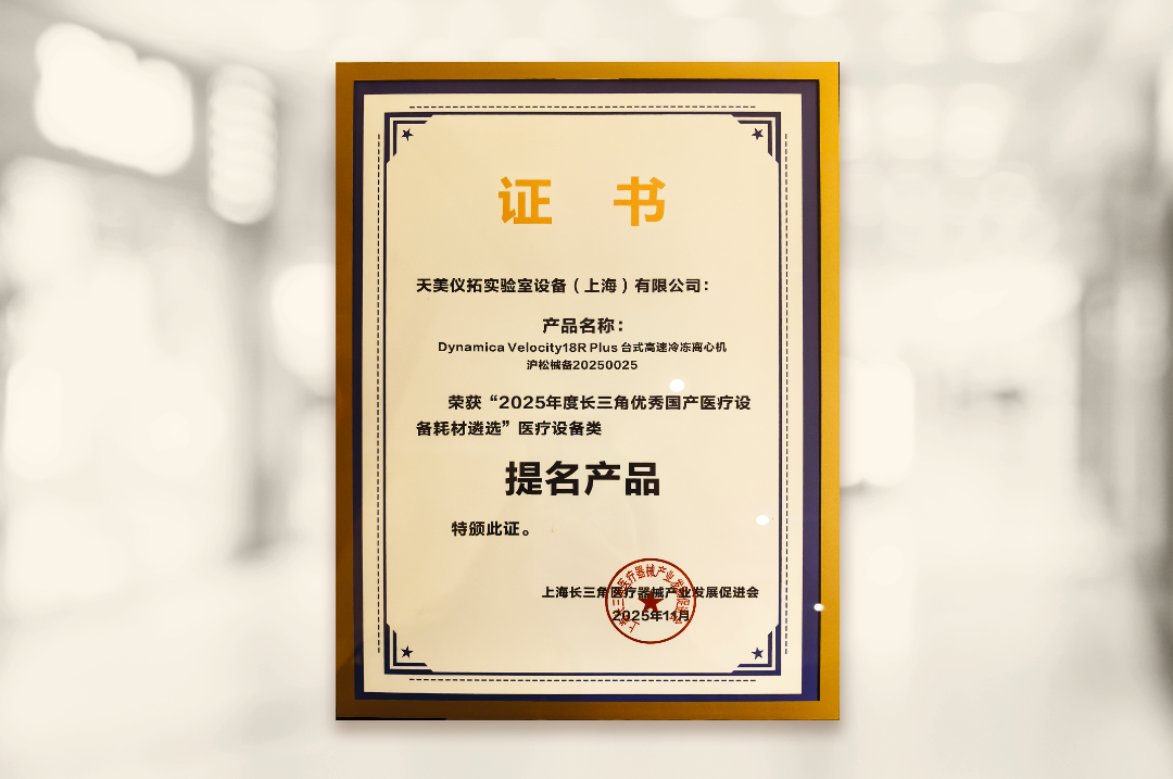 天美旗下Dynamica Velocity18R Plus臺(tái)式高速冷凍離心機(jī)從眾多國(guó)產(chǎn)設(shè)備中脫穎而出,榮獲“2025年度長(zhǎng)三角優(yōu)秀國(guó)產(chǎn)醫(yī)療設(shè)備耗材遴選”醫(yī)療設(shè)備類(lèi)提名產(chǎn)品。