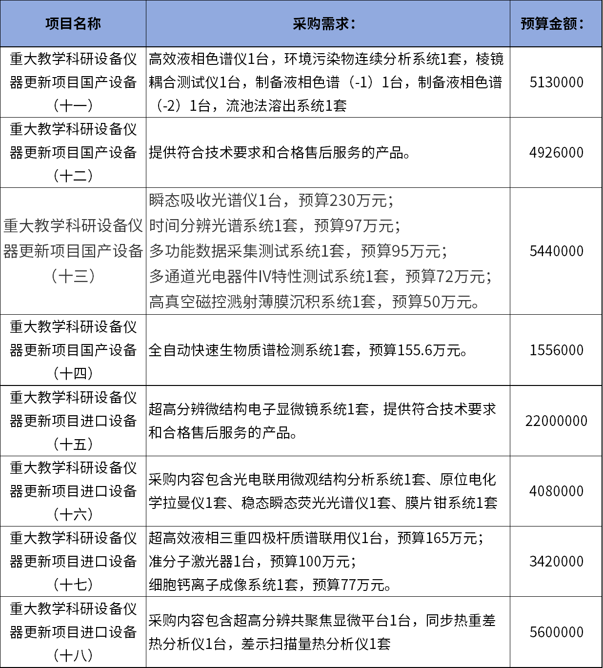 近日,河北大學發布一批重大教學科研設備儀器更新項目國產設備、進口設備采購公告。預算金額5215.2萬元,采購高效液相色譜儀、瞬態吸收光譜儀、全自動快速生物質譜檢測系統、超高分辨微結構電子顯微鏡系統、超高效液相三重四極桿質譜聯用儀、高分辨共聚焦顯微平臺等設備。