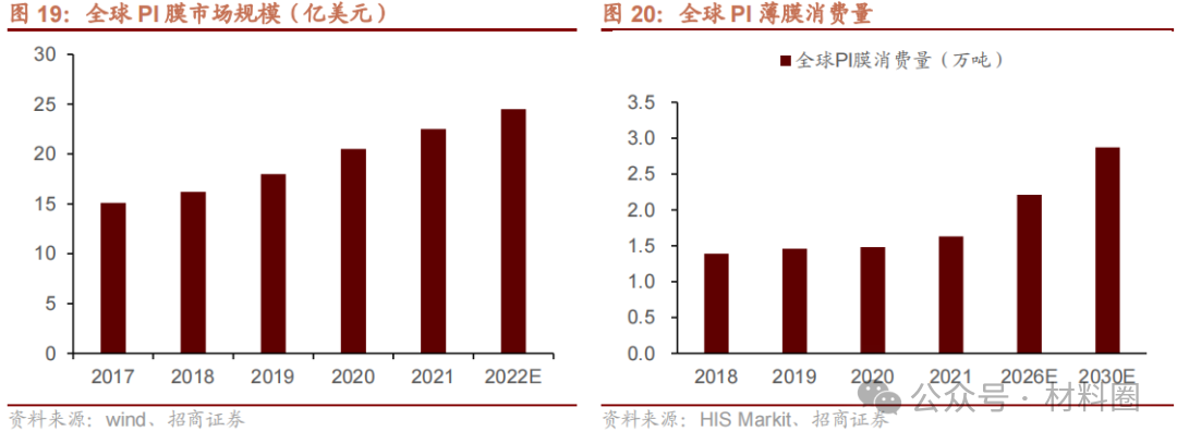 聚酰亞胺薄膜(PI 膜)是最早進入商業(yè)流通且用量最大的PI材料。2021年,全球PI薄膜消費量1.63萬噸,預計到2030年將達到2.9萬噸,年均復合增長率達6.5%,全球PI薄膜市場規(guī)模22.5億美元。