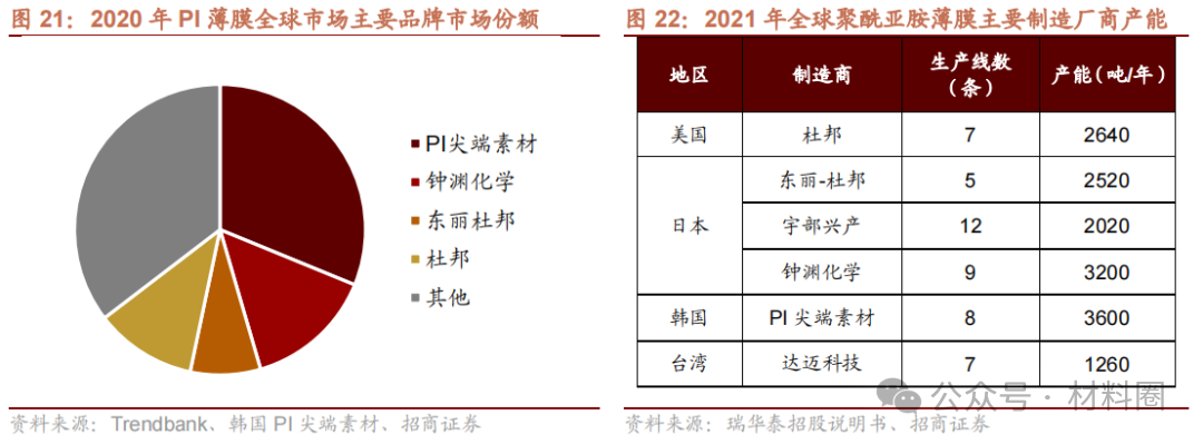 PI薄膜行業(yè)呈寡頭壟斷,產(chǎn)能集中于美、日、韓。生產(chǎn)高性能PI膜對設備定制、制作工藝、技術人才等方面要求苛刻,再加上發(fā)達國家行業(yè)寡頭對PI薄膜生產(chǎn)技術、生產(chǎn)工藝進行嚴格保護。目前這一領域呈現(xiàn)寡頭壟斷的競爭格局,90%以上的市場份額掌握在美國、日本、韓國生產(chǎn)商的手中。杜邦(Dupont)、日本宇部興產(chǎn)(Ube)、鐘淵化學(Kaneka)、日本三菱瓦斯MGC、韓國PI尖端素材(原SKPI)以及中國臺灣地區(qū)達邁科技(Taimide)是當前全球聚酰亞胺薄膜的主要生產(chǎn)商。