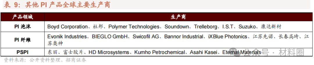 其他PI產(chǎn)品應用大多局限于軍事領域,尚未形成大規(guī)模商業(yè)化應用。聚酰亞胺纖維目前售價較高,目前主要以其獨特的低溫適用性(勝任外太空-100℃以下溫度環(huán)境)用于航空航天領域。目前實現(xiàn)大規(guī)模生產(chǎn)的廠商只有目前德國Evonik(P84纖維)和我國長春高琦(軼綸纖維)。PI泡沫目前最為重要的應用為艦艇用隔熱降噪材料,美國海軍已把 PI 泡沫用作所有水面艦艇和潛艇的隔熱隔聲材料,INSPEC 公司生產(chǎn)的SOLIMIDE 泡沫已被超過 15 個國家制定用于海軍船舶的隔熱隔聲體系,但其暫未大規(guī)模進入民用領域。