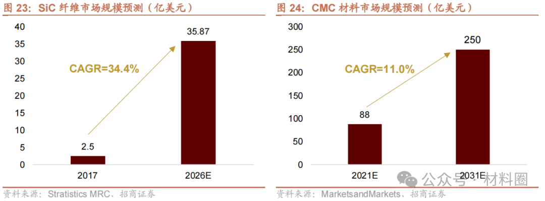 預計未來各國對航空航天領域的投入加大,推動SiC纖維規(guī)模高速增長。根據(jù)Stratistics MRC預測,2026年SiC纖維的市場規(guī)模將增長至35.87億美元,2017~2026年間復合年增長率將達到34.4%。SiC纖維下游最主要的應用之一是SiC纖維復合陶瓷基材料(CMC材料),未來十年,伴隨著綜合國力的增強以及國際形勢的不確定性,以中國為代表的主要發(fā)展中國家有望加大航空航天領域的投入力度。在此背景下,憑借輕量化、高耐熱、抗氧化的顯著優(yōu)勢,CMC材料的使用率有望大幅增長。根據(jù)MarketsandMarkets預測,到2031年,全球CMC材料市場規(guī)模將達到250億美元,2021~2031年間復合年增長率將達到11.0%。