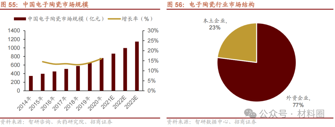 在下游光纖通訊、國防軍事等應用場景擴大及高速增長、下游利好國家政策的作用下,國內(nèi)電子陶瓷市場規(guī)模由2014年的346.6億元增長至2019年的657.7億元,國內(nèi)電子陶瓷企業(yè)向高端化、高附加值轉型升級的方向不斷推進。預計我國電子陶瓷市場規(guī)模億年復合增長率15%的速度在2023年達到1145.4億元。在市場結構上,與日本、美國電子陶瓷企業(yè)相比,我國電子陶瓷企業(yè)中低端產(chǎn)品依然占據(jù)主流。電子整機中很多技術含量高的陶瓷元器件仍然依賴進口,在市場規(guī)模、產(chǎn)品檔次與技術水平上依然存在一定差距。數(shù)據(jù)顯示,中國本土電子陶瓷企業(yè)在國內(nèi)僅占據(jù)23%的市場份額,其余77%的市場份額仍被日本、美國等外資企業(yè)占據(jù)。