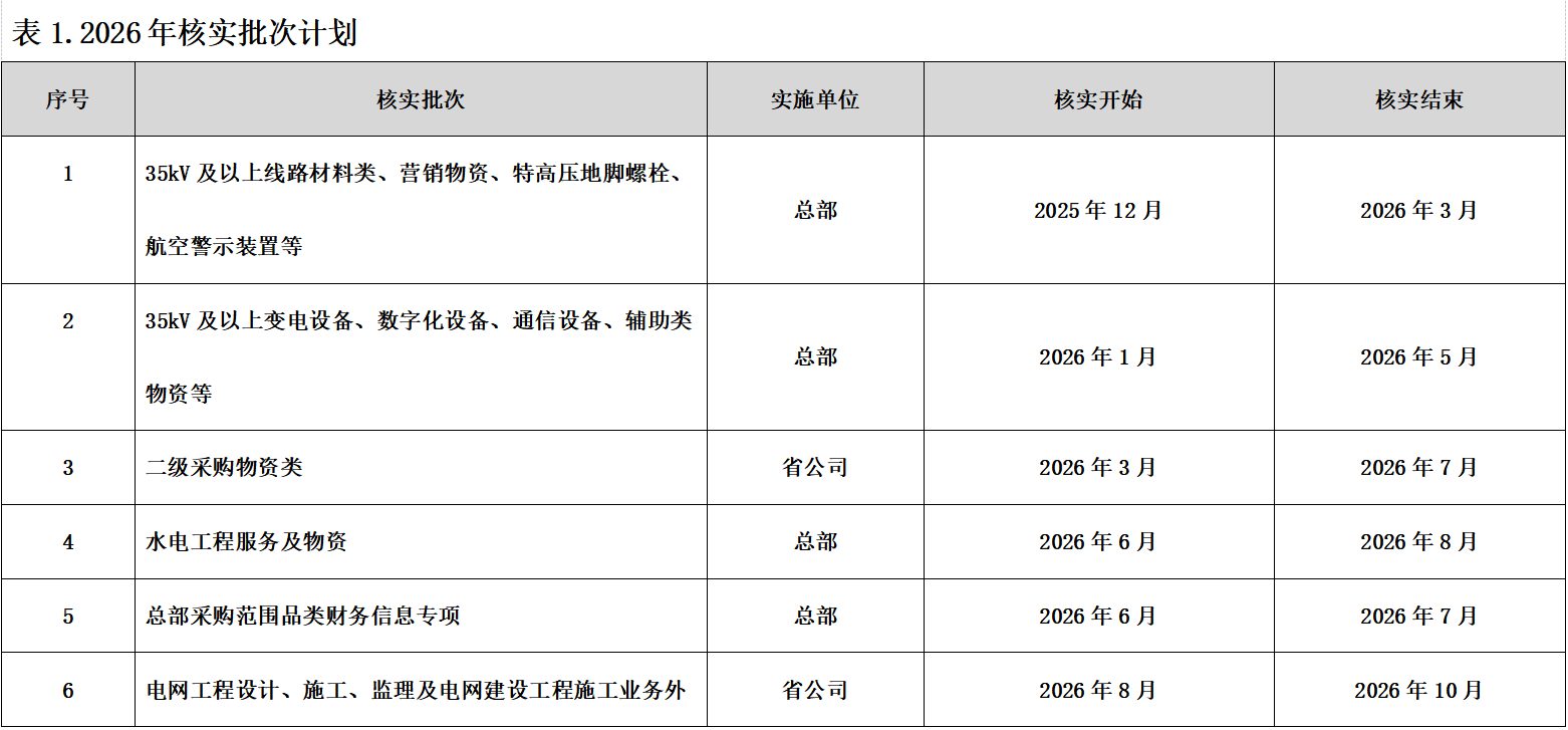 2026年核實(shí)工作計(jì)劃如表1。根據(jù)實(shí)際情況,核實(shí)時(shí)間可能有所調(diào)整,各批次具體安排將在國(guó)家電網(wǎng)有限公司新一代電子商務(wù)平臺(tái)(以下簡(jiǎn)稱“ECP2.0”)提前發(fā)布公告,請(qǐng)以相關(guān)公告為準(zhǔn)。